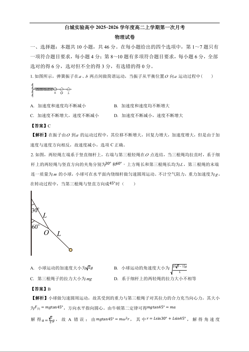 高二物理答案--吉林省白城市实验高级中学2025-2026学年高二上学期10月月考