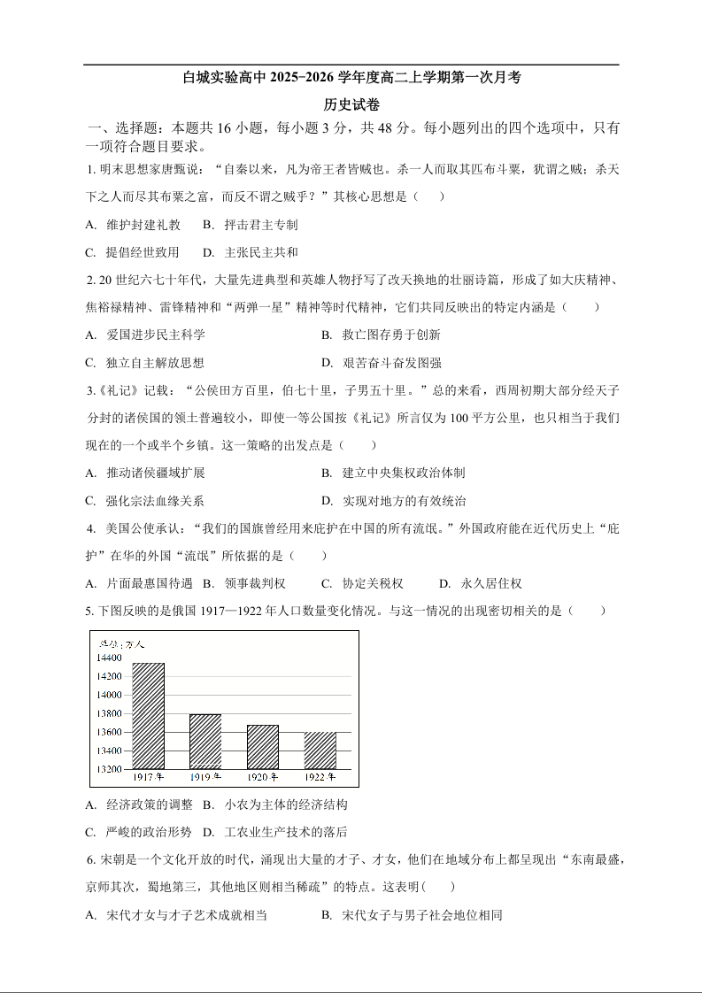 高二历史--吉林省白城市实验高级中学2025-2026学年高二上学期10月月考
