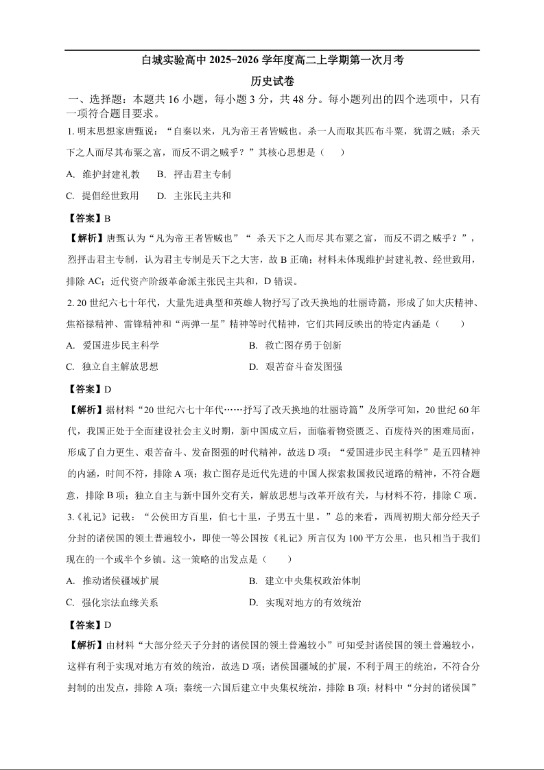 高二历史答案--吉林省白城市实验高级中学2025-2026学年高二上学期10月月考