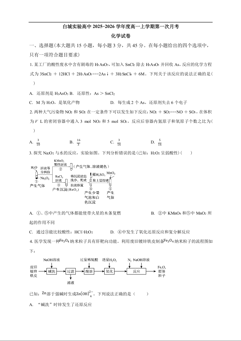 高一化学--吉林省白城市实验高级中学2025-2026学年高一上学期10月月考