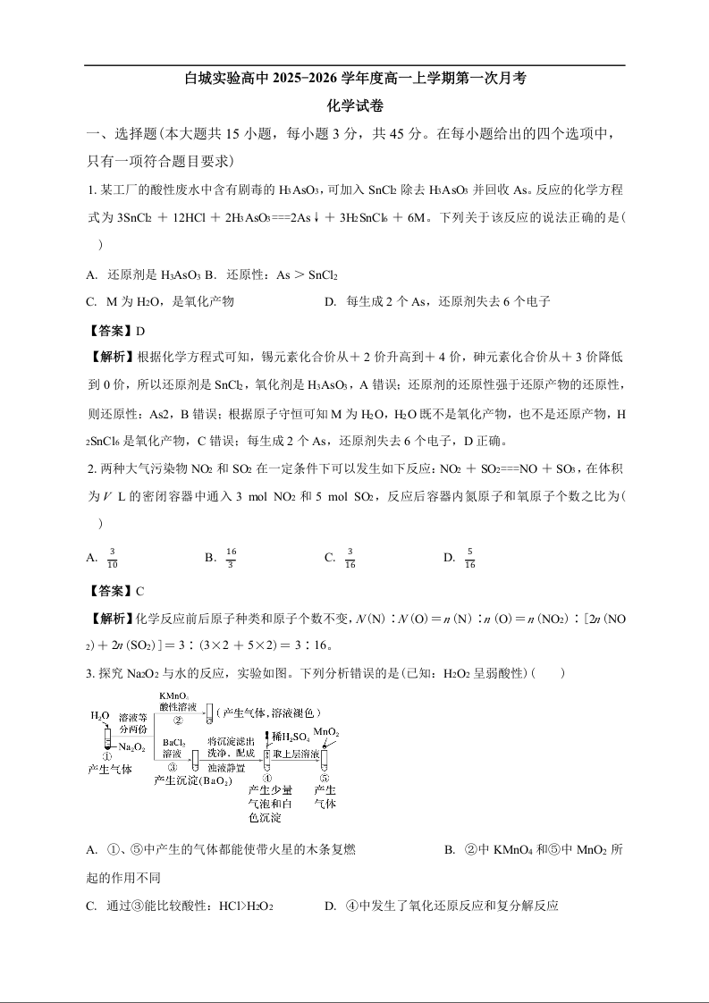 高一化学答案--吉林省白城市实验高级中学2025-2026学年高一上学期10月月考