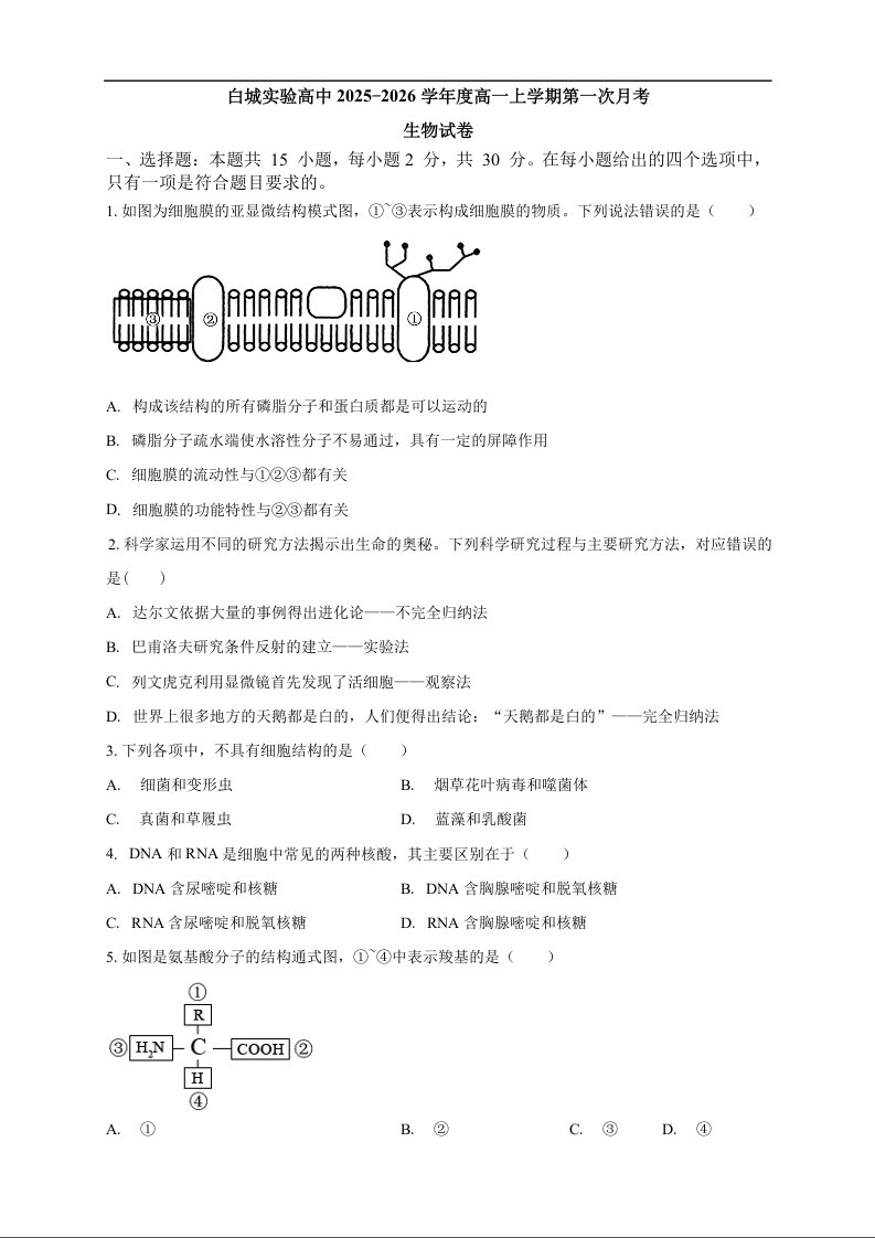 高一生物--吉林省白城市实验高级中学2025-2026学年高一上学期10月月考