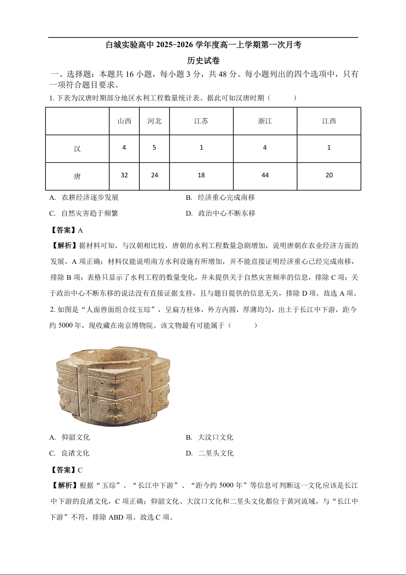 高一历史答案--吉林省白城市实验高级中学2025-2026学年高一上学期10月月考