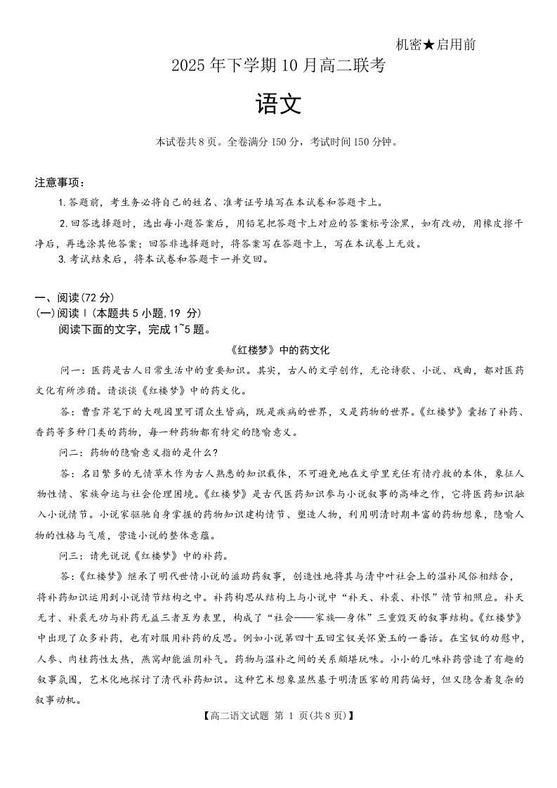 高二语文--湖南天壹名校联盟2025年下学期10月高二联考