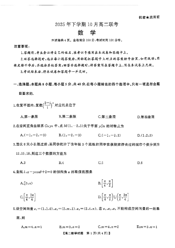 高二数学--湖南天壹名校联盟2025年下学期10月高二联考
