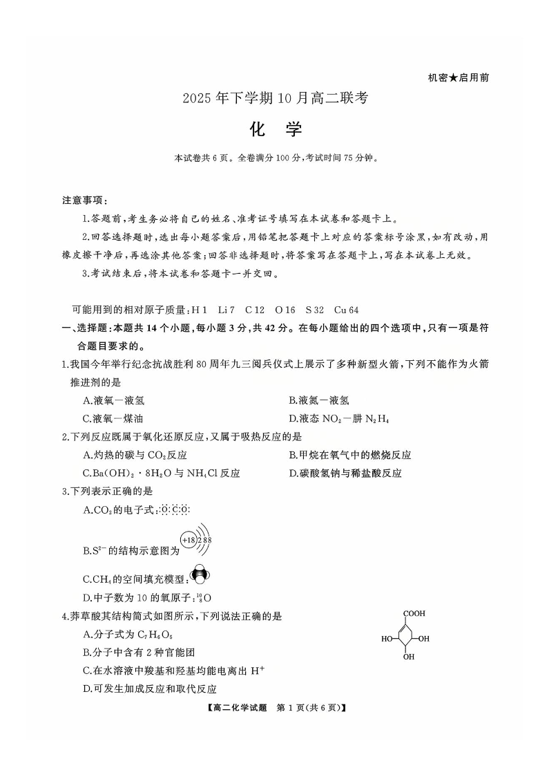 高二化学--湖南天壹名校联盟2025年下学期10月高二联考