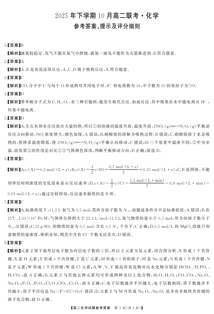高二化学答案--湖南天壹名校联盟2025年下学期10月高二联考