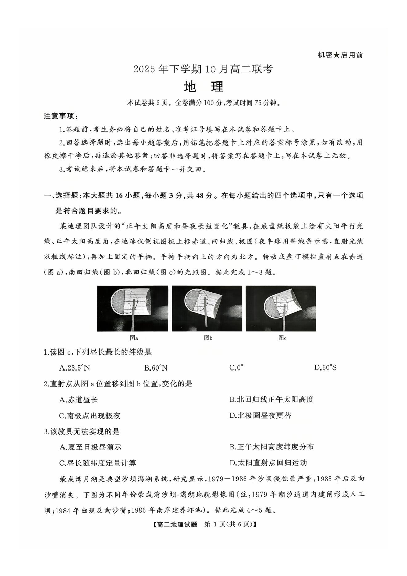 高二地理--湖南天壹名校联盟2025年下学期10月高二联考
