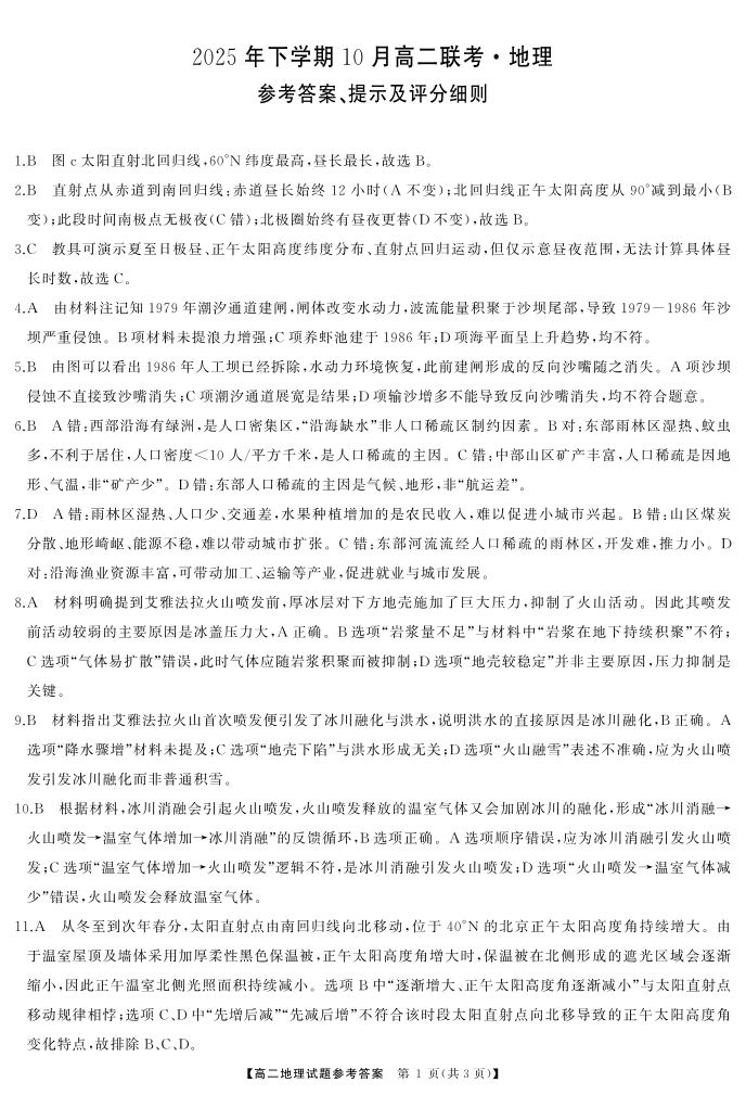 高二地理答案--湖南天壹名校联盟2025年下学期10月高二联考