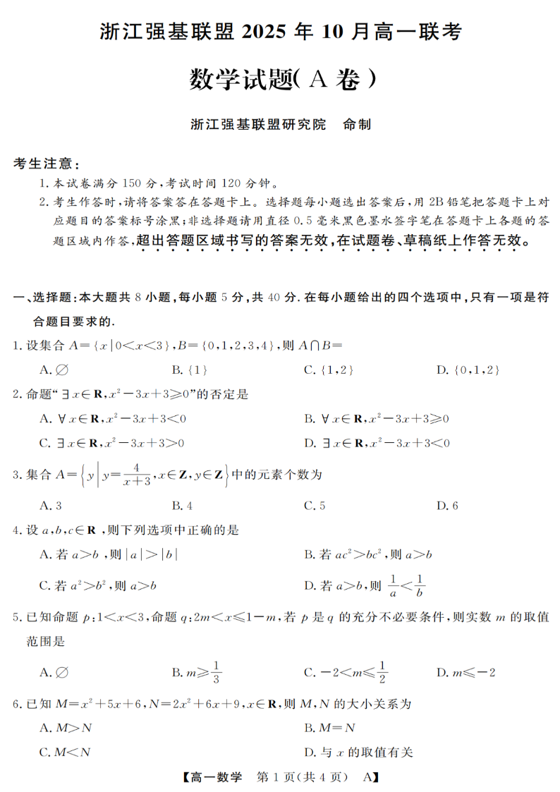 高一数学--浙江省强基联盟2025-2026学年高一上学期10月联考A卷