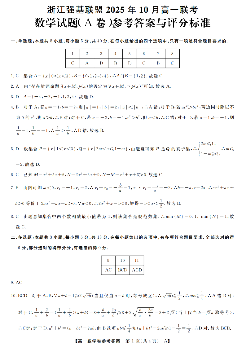 高一数学答案--浙江省强基联盟2025-2026学年高一上学期10月联考A卷