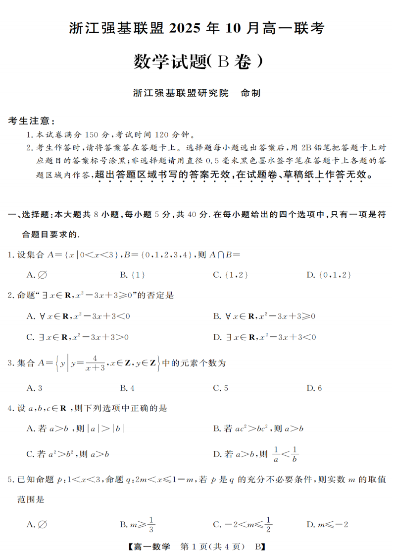高一数学--浙江省强基联盟2025-2026学年高一上学期10月联考B卷