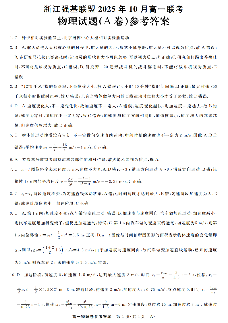 高一物理答案--浙江省强基联盟2025-2026学年高一上学期10月联考A卷