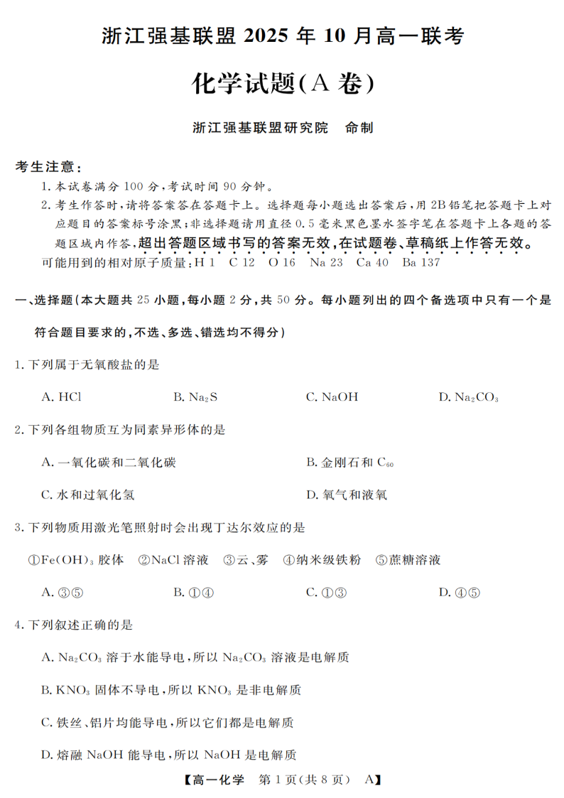 高一化学--浙江省强基联盟2025-2026学年高一上学期10月联考A卷