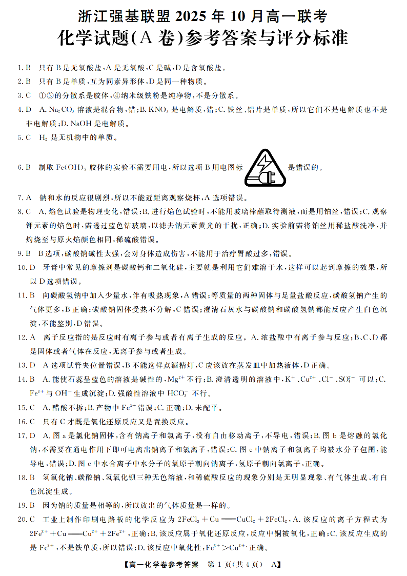高一化学答案--浙江省强基联盟2025-2026学年高一上学期10月联考A卷