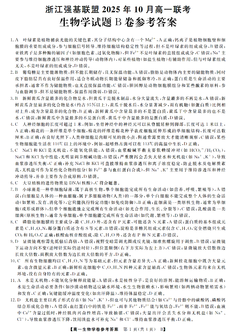 高一生物--浙江省强基联盟2025-2026学年高一上学期10月联考B卷