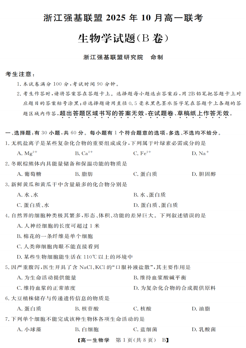 高一生物答案--浙江省强基联盟2025-2026学年高一上学期10月联考B卷