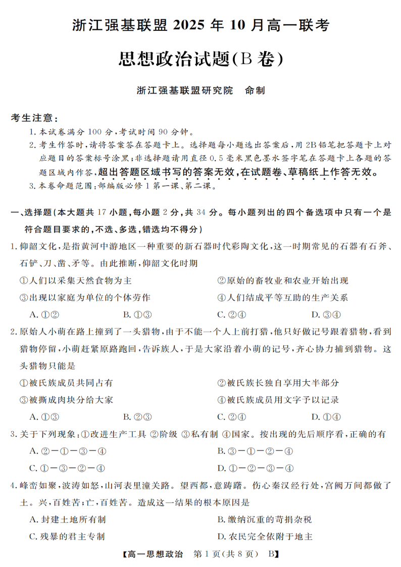 高一政治--浙江省强基联盟2025-2026学年高一上学期10月联考B卷
