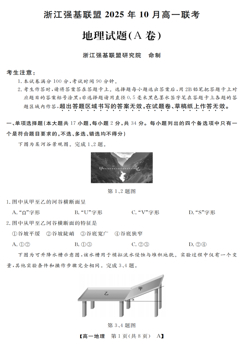 高一地理--浙江省强基联盟2025-2026学年高一上学期10月联考A卷