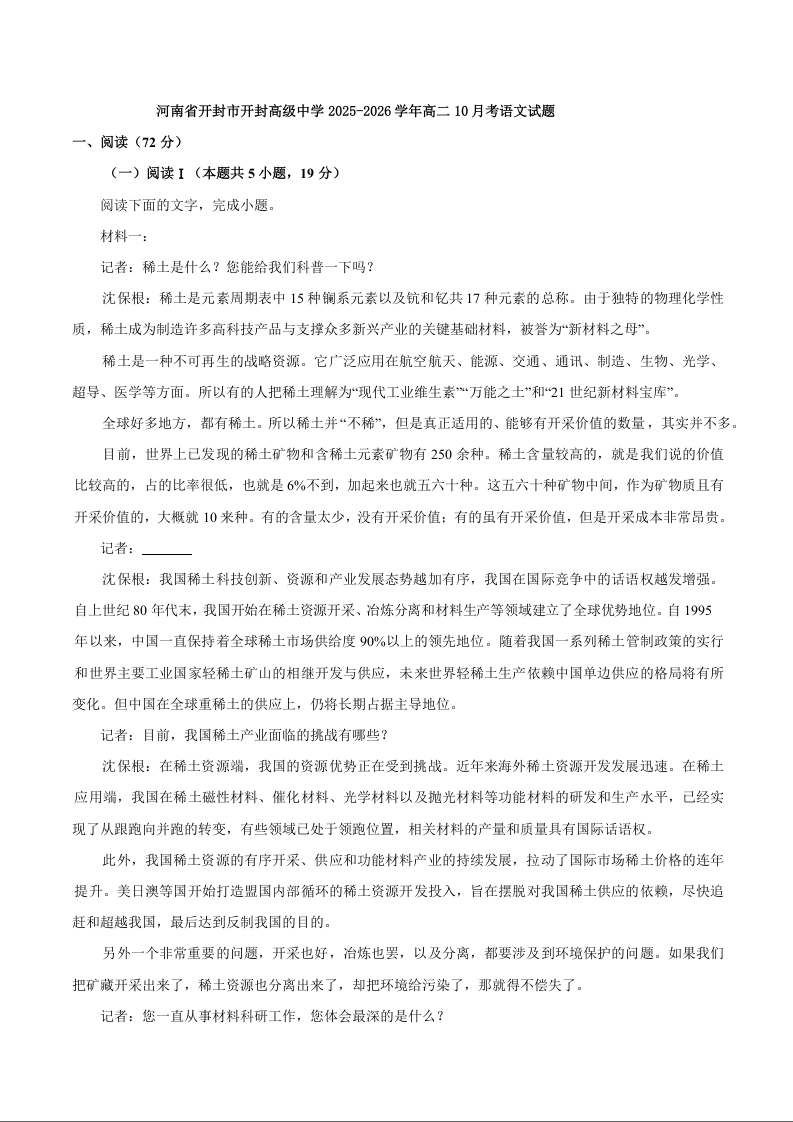 高二语文+答案--河南省开封高级中学2025-2026学年高二上学期10月质量检测