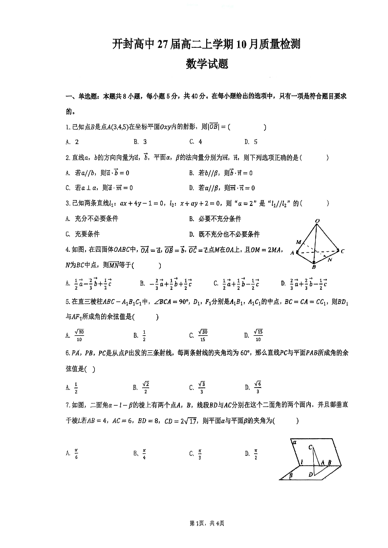 高二数学+答案--河南省开封高级中学2025-2026学年高二上学期10月质量检测