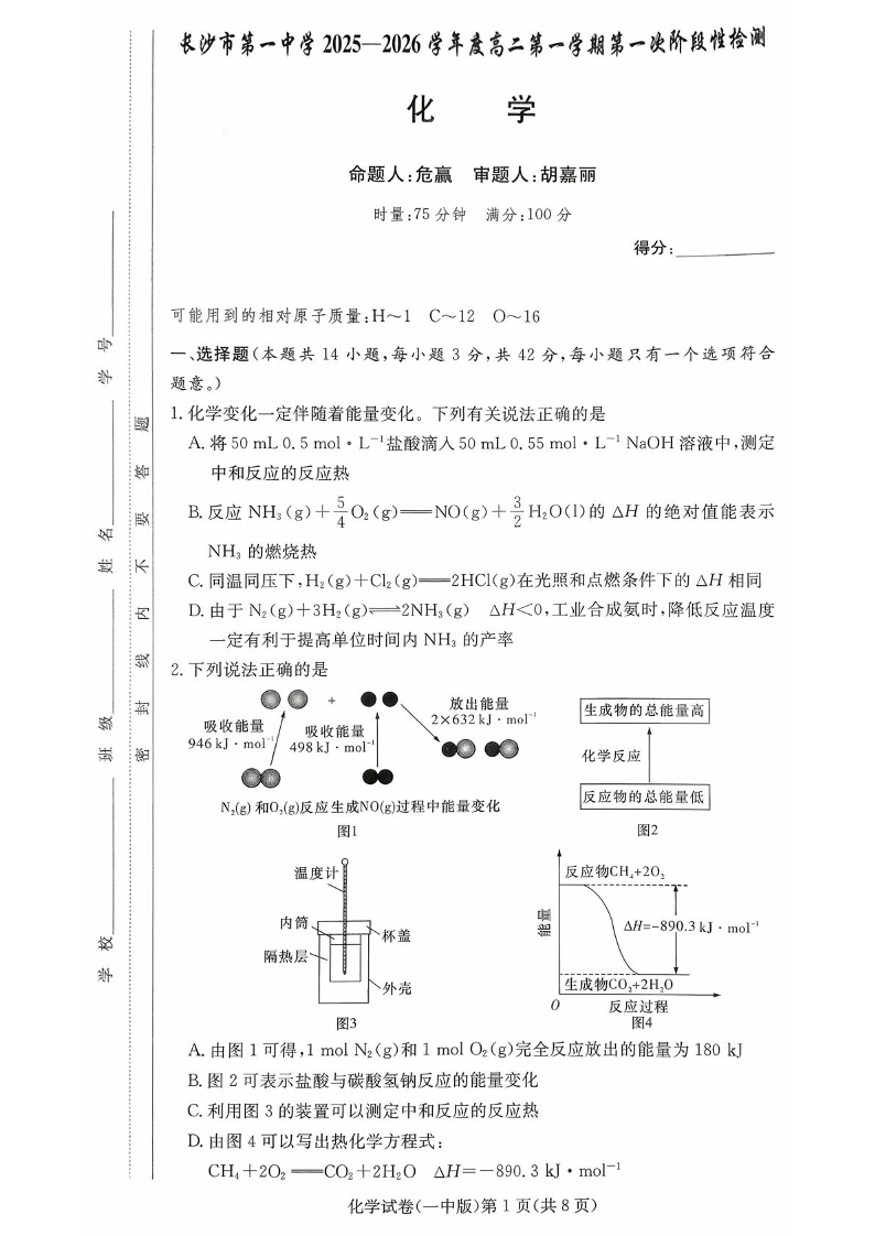 高二化学+答案--湖南省长沙市第一中学2025-2026学年高二上学期10月月考