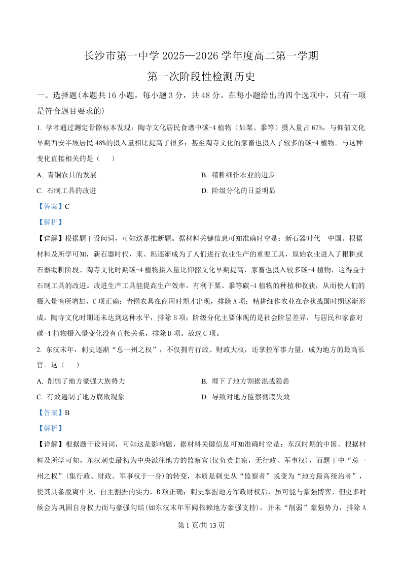 高二历史(解析版)--湖南省长沙市第一中学2025-2026学年高二上学期10月月考
