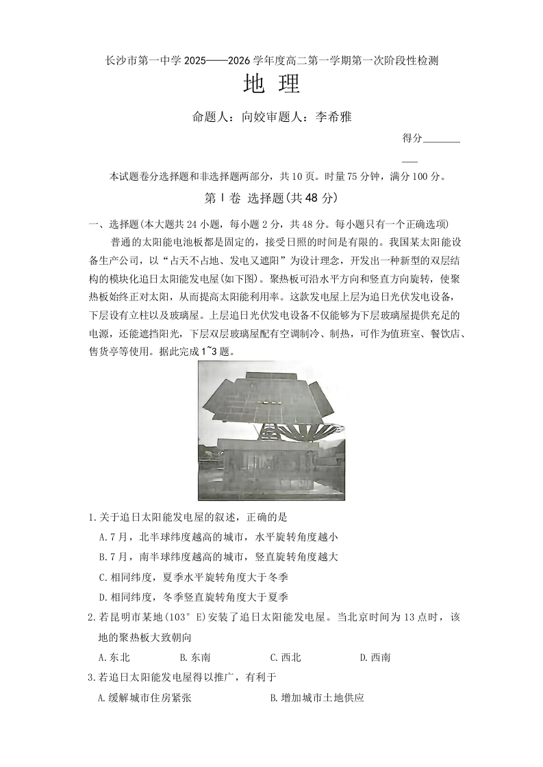 高二地理--湖南省长沙市第一中学2025-2026学年高二上学期10月月考