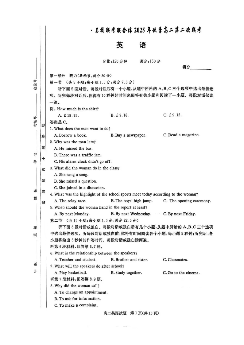 高二英语--湖南省炎德英才名校联考联合体2025年秋季高二第二次联考