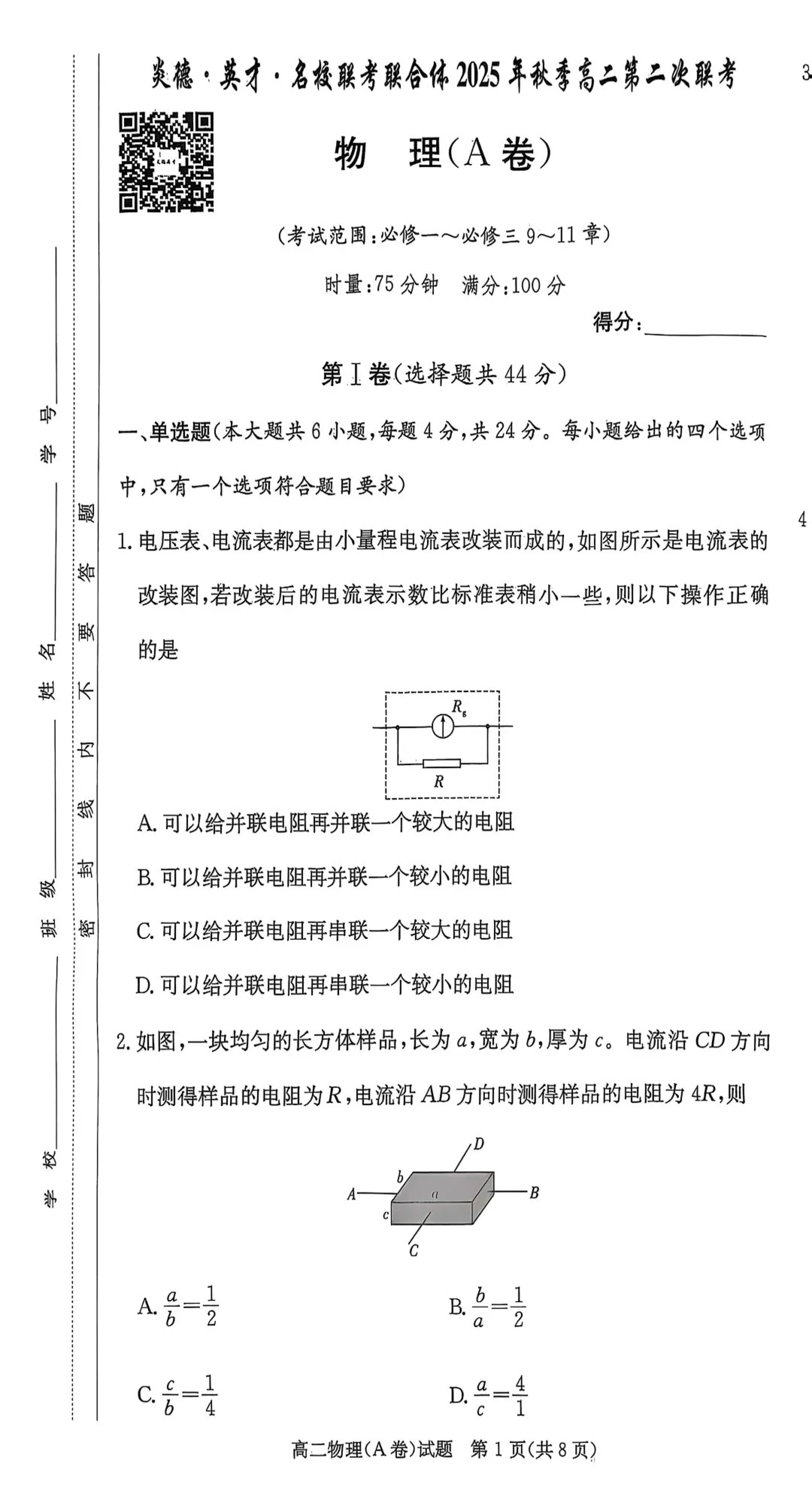 高二物理A--湖南省炎德英才名校联考联合体2025年秋季高二第二次联考
