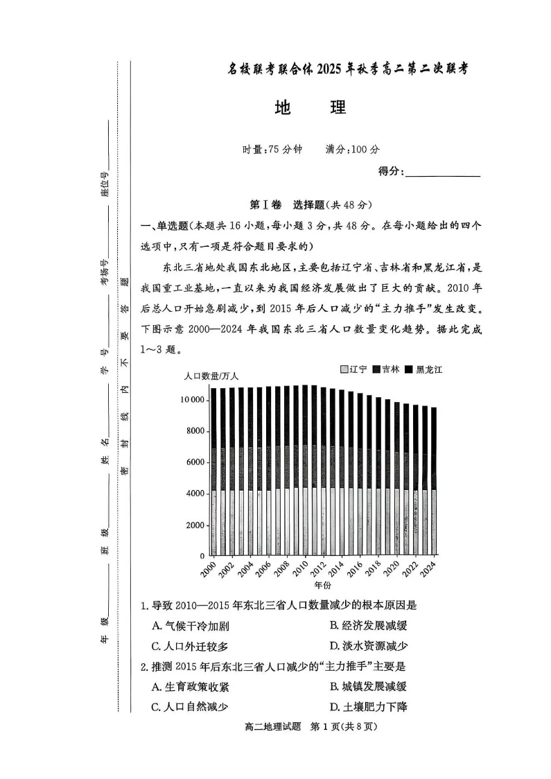 高二地理--湖南省炎德英才名校联考联合体2025年秋季高二第二次联考