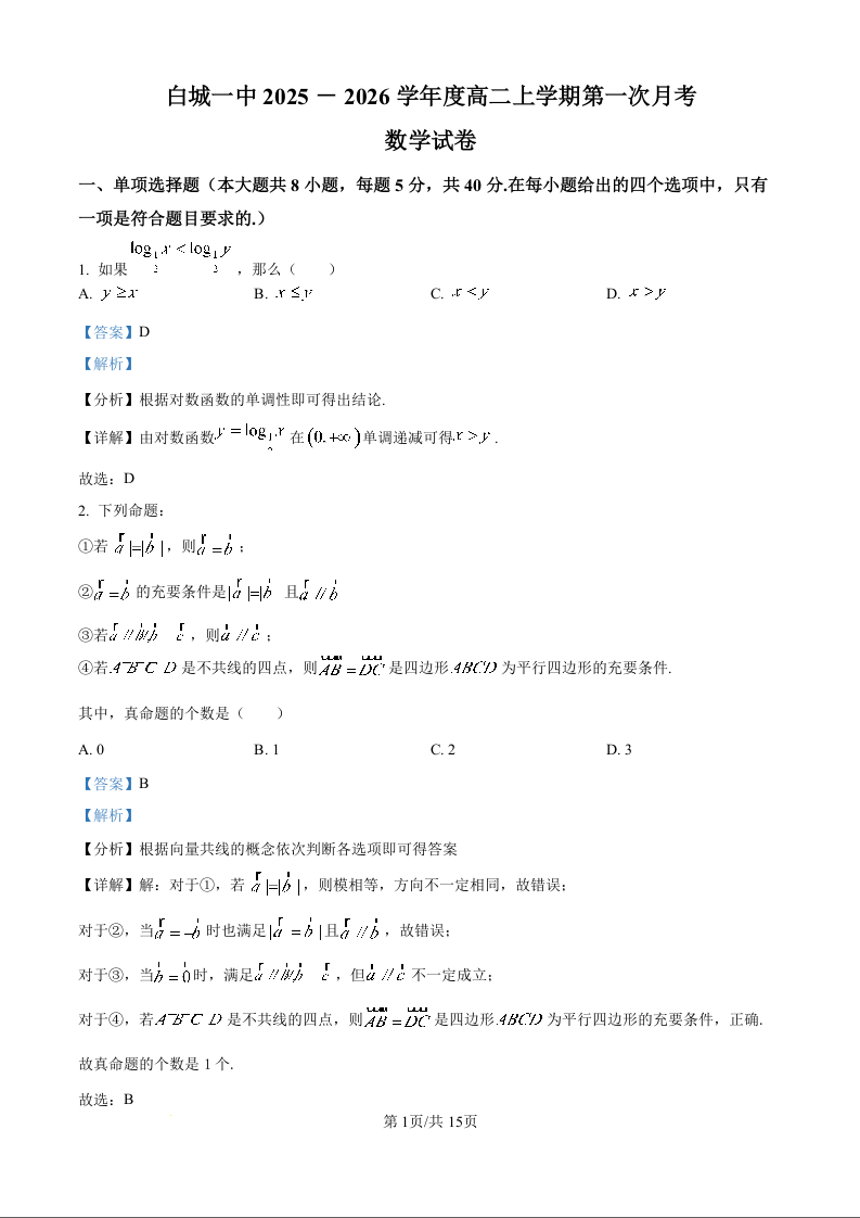 高二数学(精品解析版)--吉林省白城市第一中学2025-2026学年高二上学期第一次月考