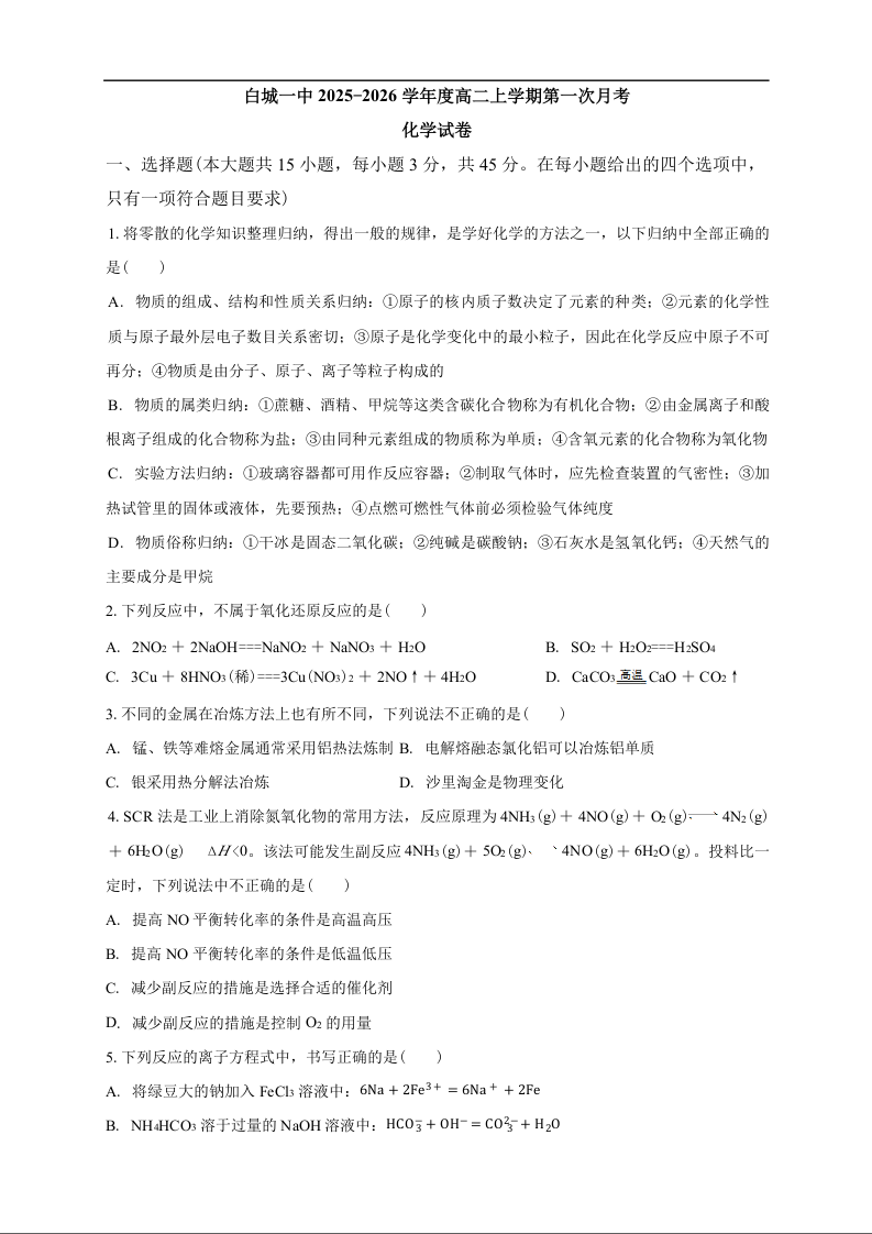 高二化学--吉林省白城市第一中学2025-2026学年高二上学期第一次月考