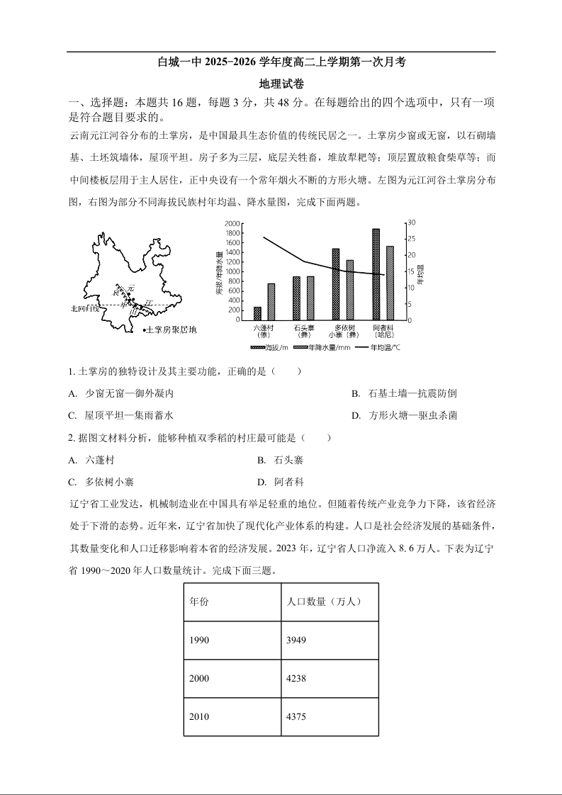 高二地理--吉林省白城市第一中学2025-2026学年高二上学期第一次月考