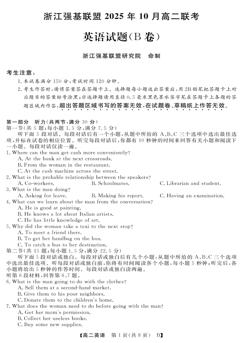 高二英语--浙江省强基联盟2025-2026学年高二上学期10月联考B卷