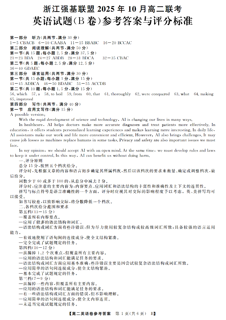 高二英语答案--浙江省强基联盟2025-2026学年高二上学期10月联考B卷