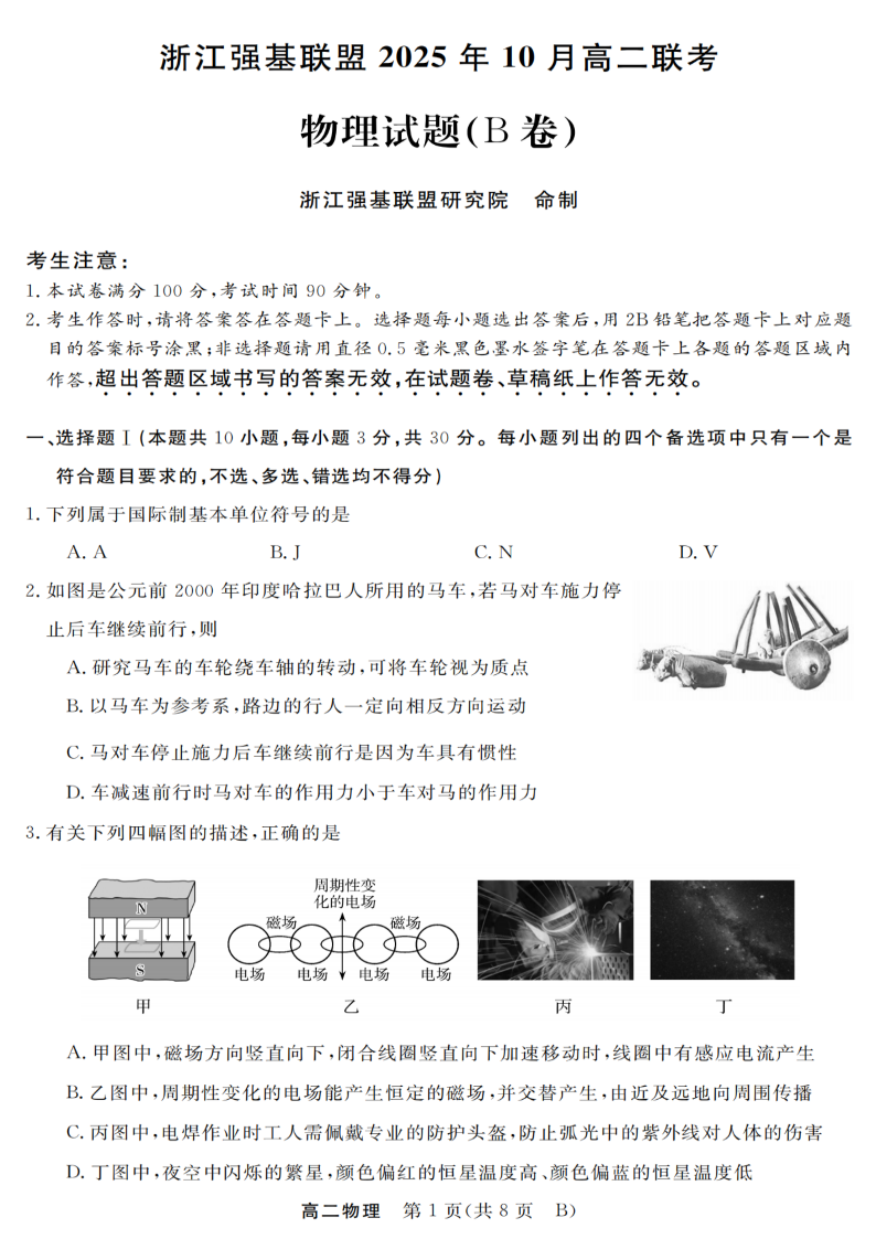 高二物理--浙江省强基联盟2025-2026学年高二上学期10月联考B卷
