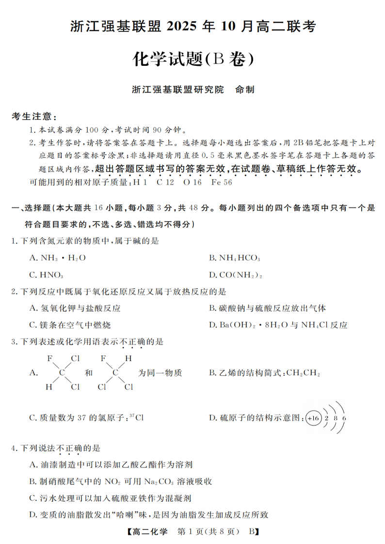 高二化学--浙江省强基联盟2025-2026学年高二上学期10月联考B卷