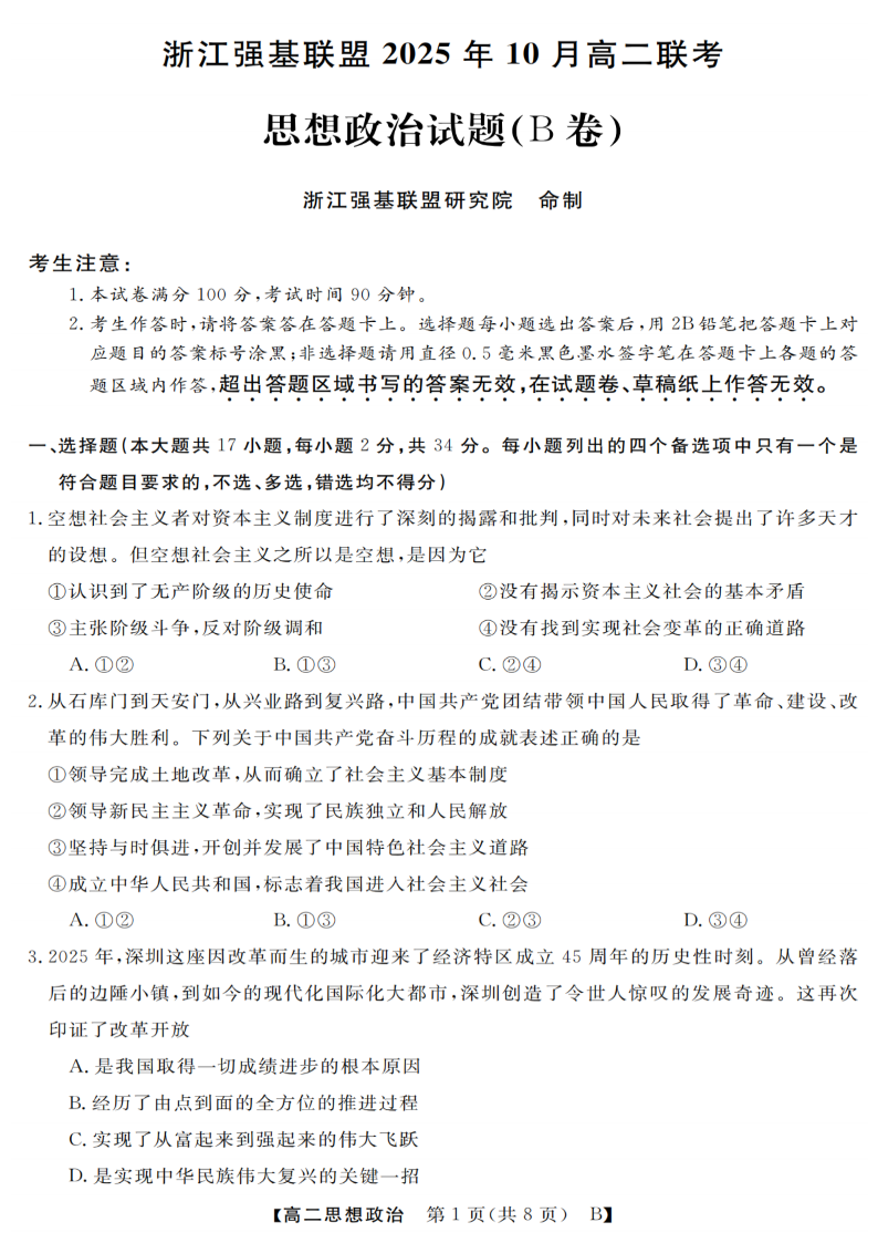 高二政治--浙江省强基联盟2025-2026学年高二上学期10月联考B卷