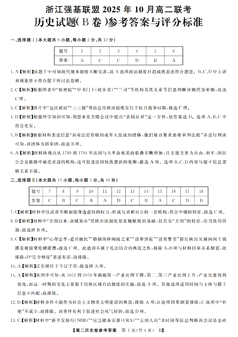 高二历史答案--浙江省强基联盟2025-2026学年高二上学期10月联考B卷