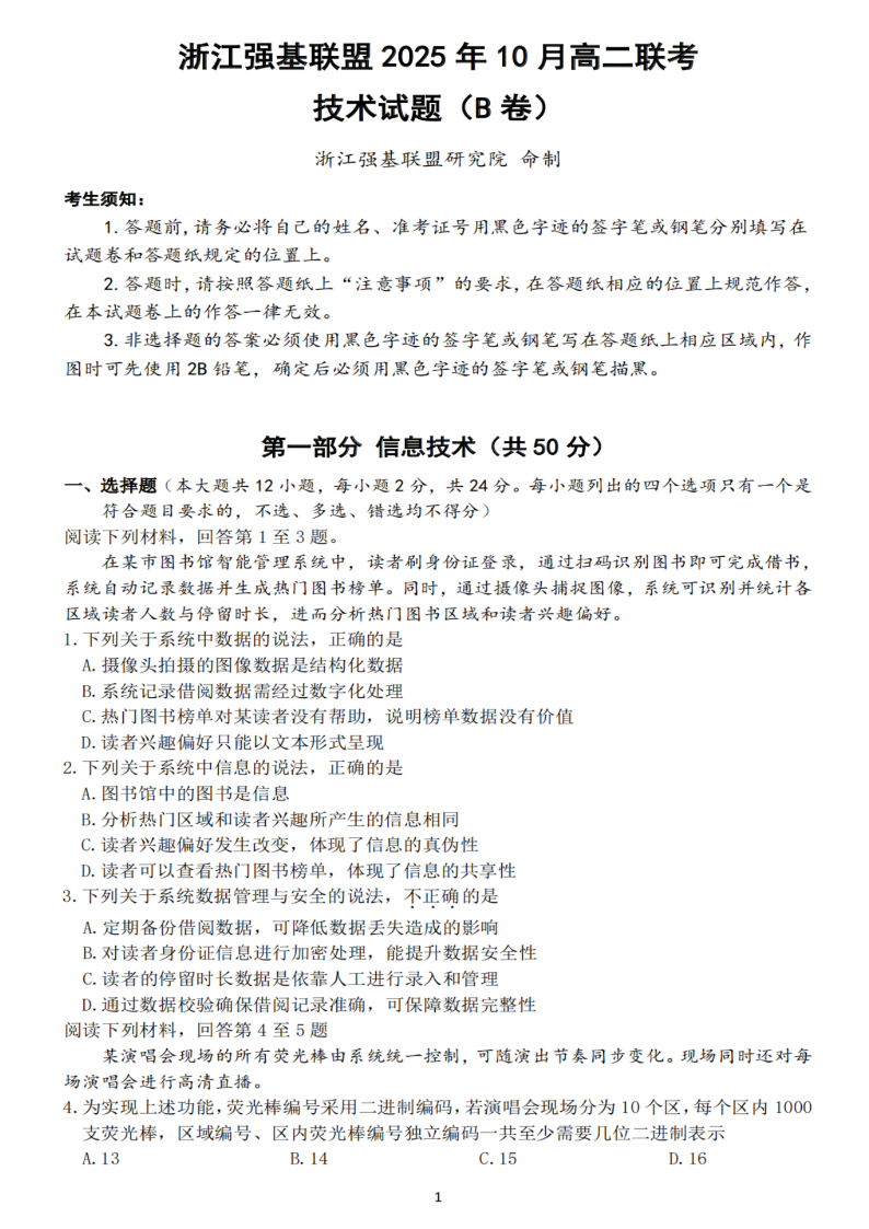 高二技术--浙江省强基联盟2025-2026学年高二上学期10月联考B卷