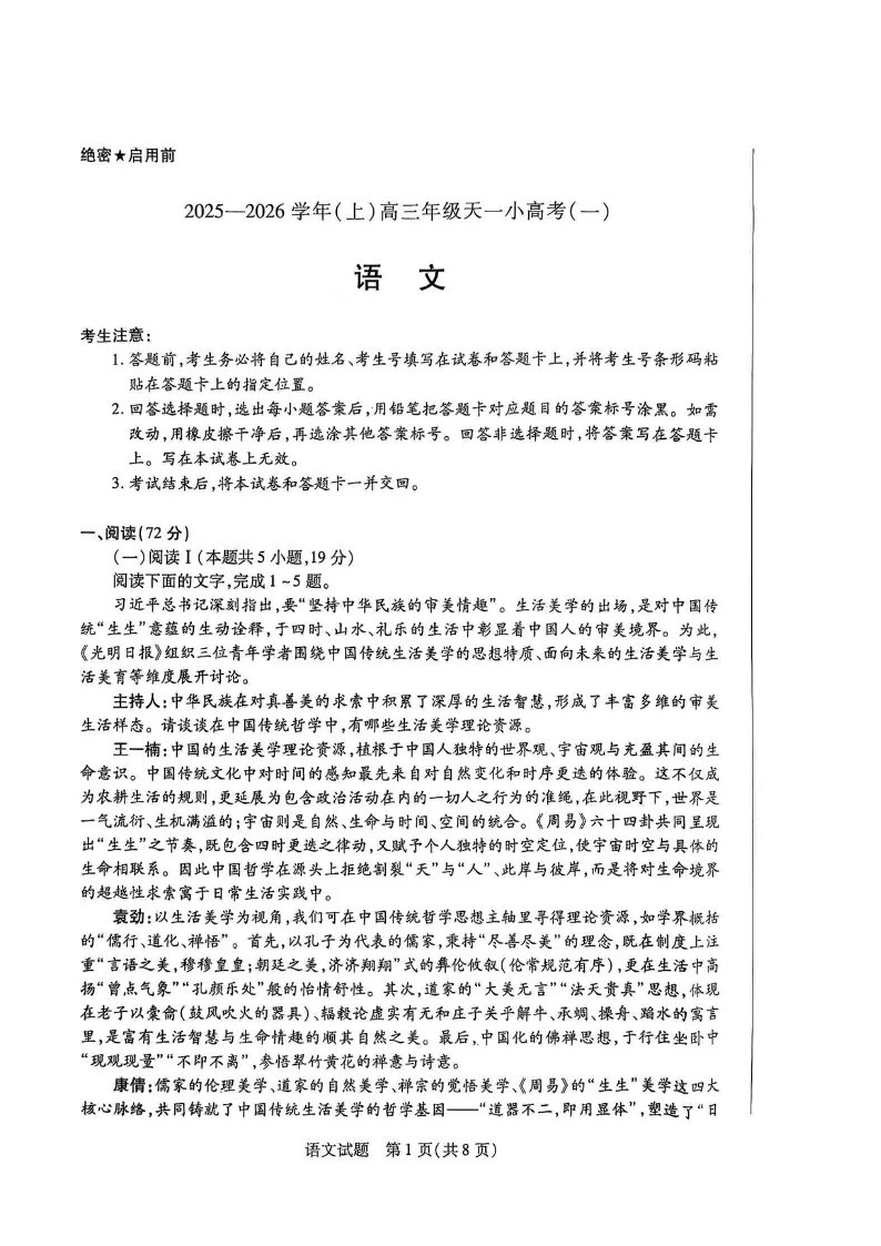 高三语文--河南省部分高中大联考2026届高三(上)天一小高考(一)