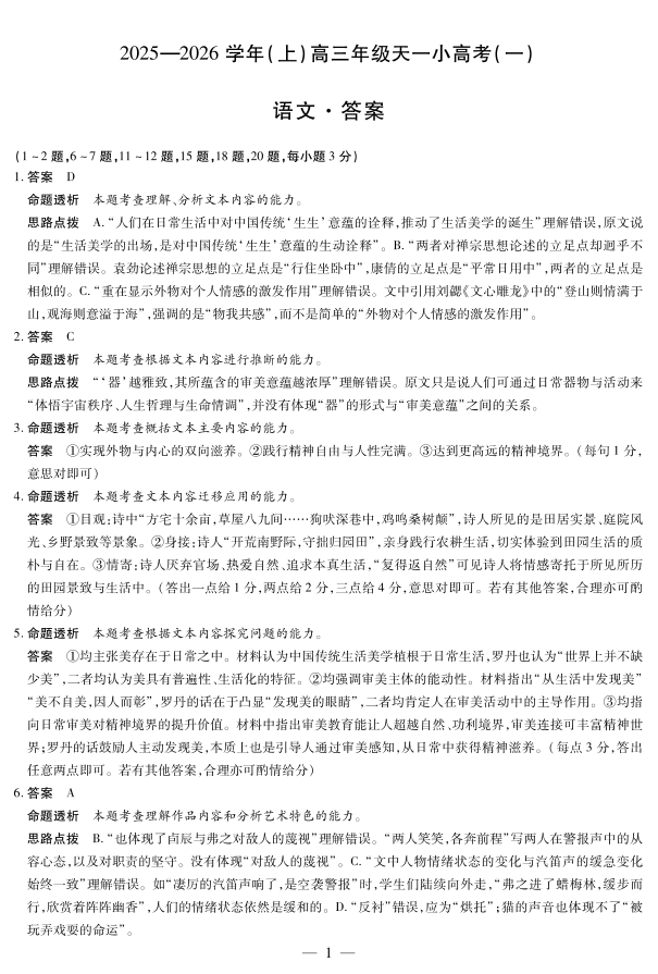高三语文答案--河南省部分高中大联考2026届高三(上)天一小高考(一)