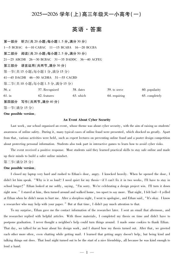 高三英语答案--河南省部分高中大联考2026届高三(上)天一小高考(一)