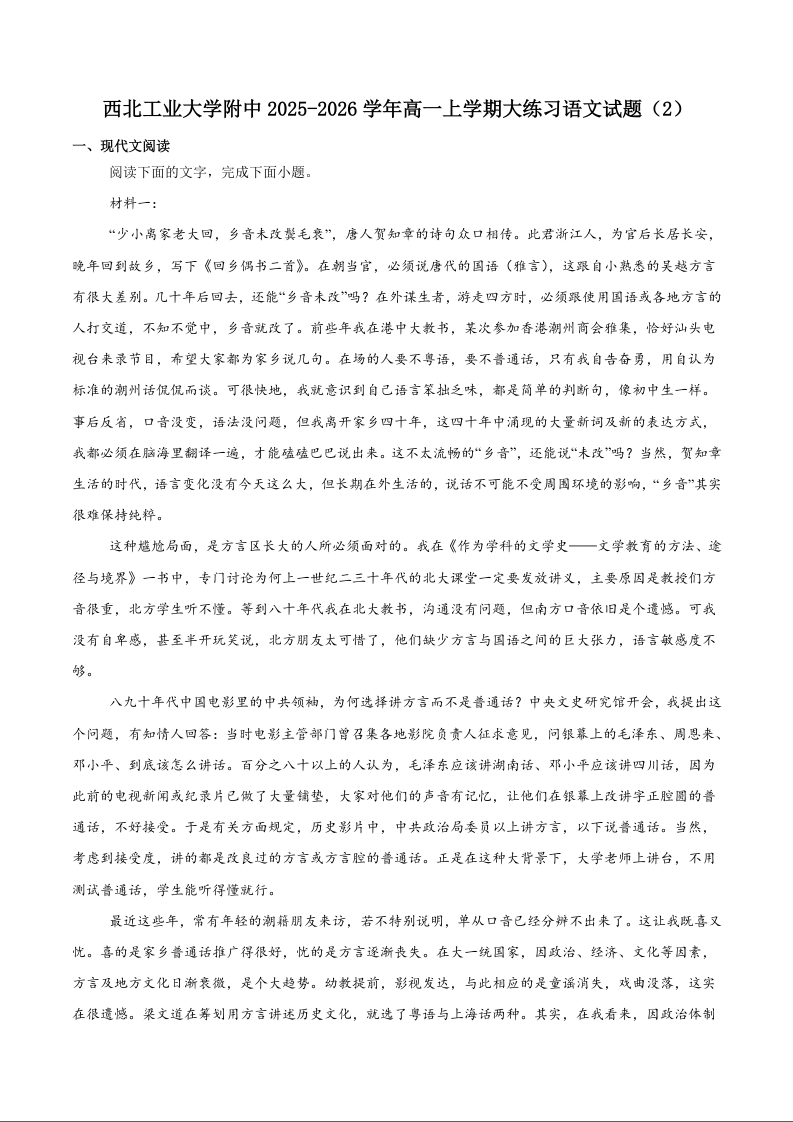 高一语文+答案--陕西省西北工业大学附属中学2025-2026学年高一上学期大练习(二)
