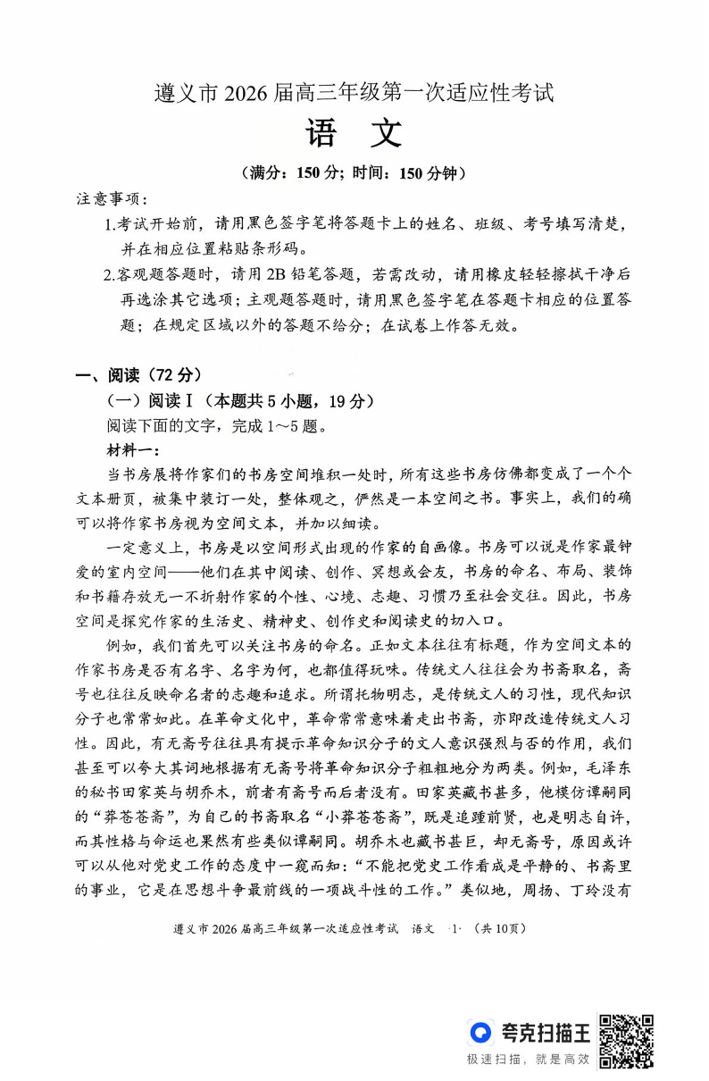 高三语文--贵州省遵义市2026届高三上学期第一次适应性考试