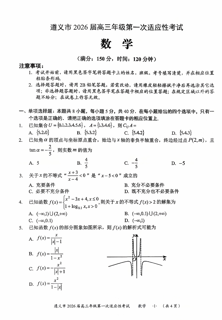 高三数学--贵州省遵义市2026届高三上学期第一次适应性考试