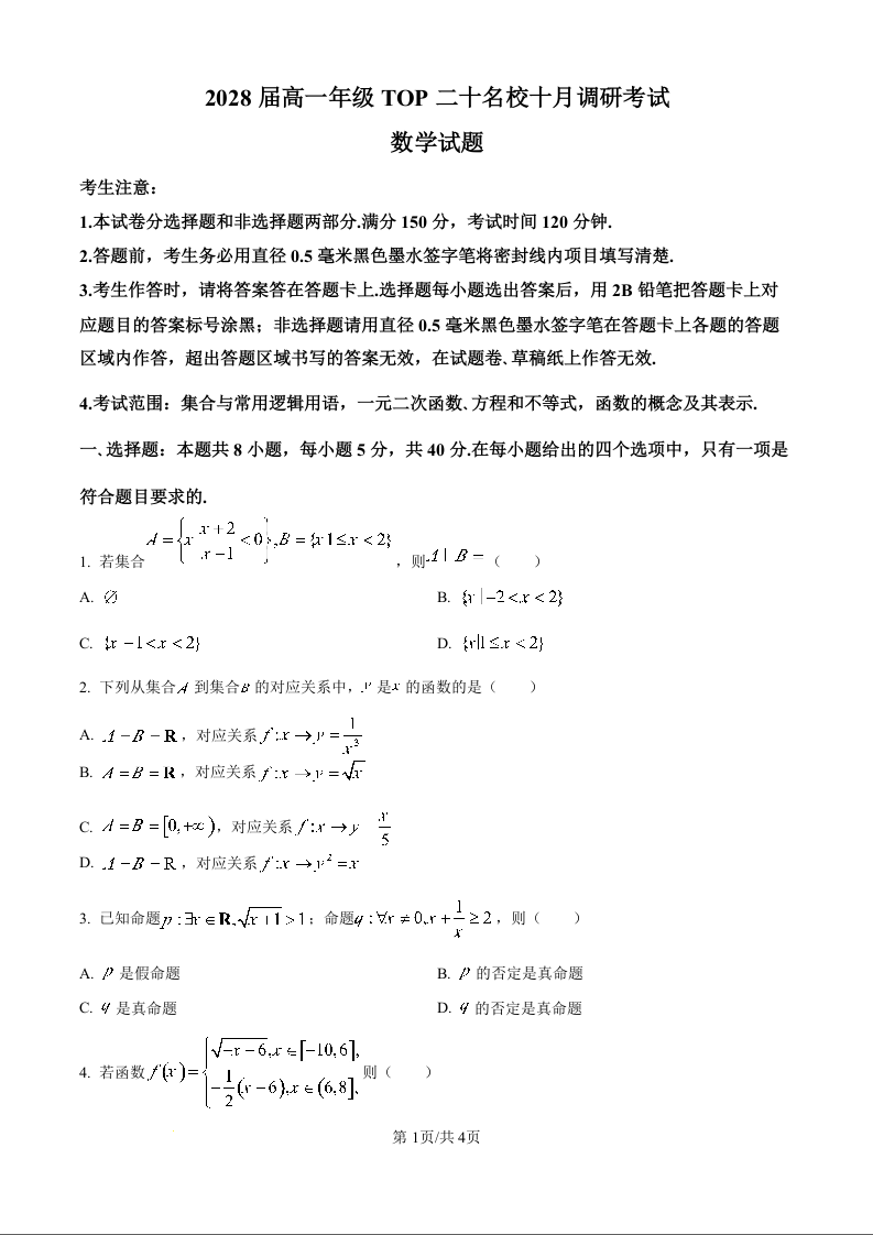 高一数学(原卷版)--河南省TOP二十名校2025-2026学年高一上学期10月调研考试