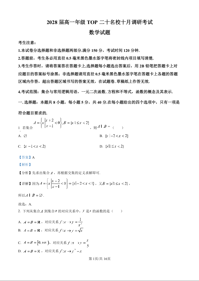 高一数学(精品解析版)--河南省TOP二十名校2025-2026学年高一上学期10月调研考试