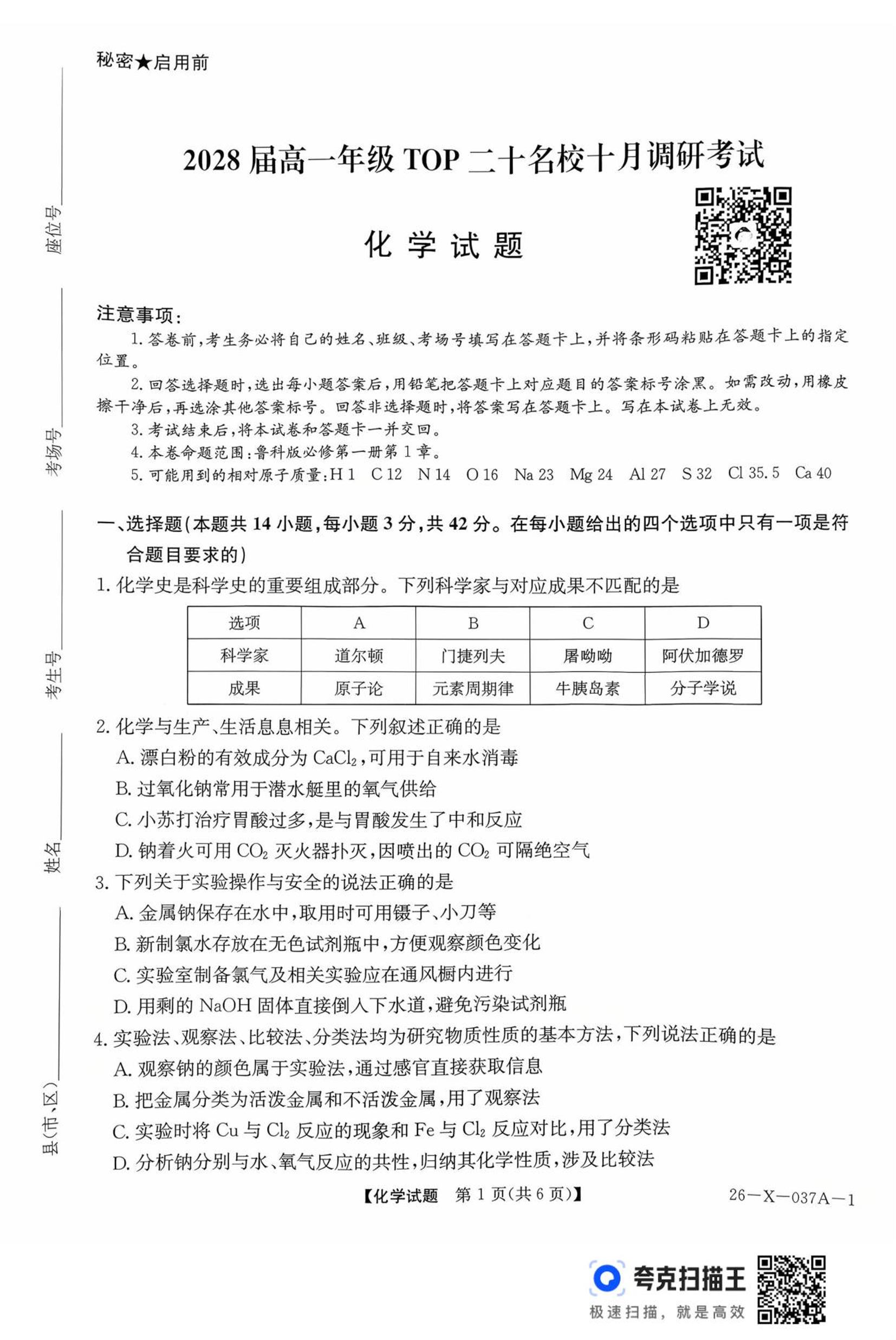 高一化学--河南省TOP二十名校2025-2026学年高一上学期10月调研考试